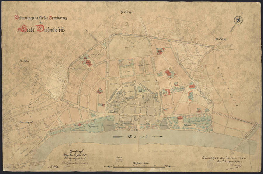 Après la reddition de la place en 1870 et la chute du Second Empire, la quasi-totalité de la Moselle et les deux départements de l’Alsace deviennent dorénavant des terres d’Empire. Thionville, devenue alors Diedenhofen, n’en continue pas moins d’être une ville de garnison mais rapidement la ville connaît une évolution démographique et économique qui entraînera les autorités à phosphorer sur son futur urbanistique. A cet effet, pour moderniser et embellir la ville endormie, on décide de faire appel à l’un des plus grands urbanistes de son temps : Joseph Stübben (1845-1936).
