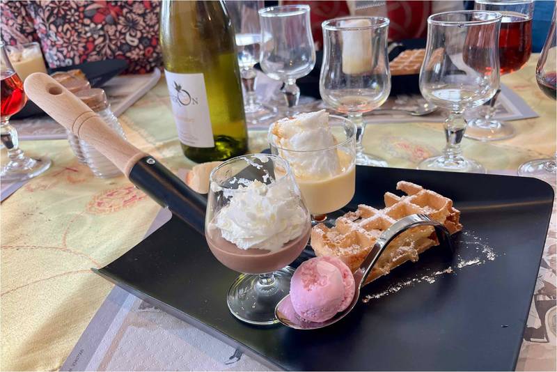 La matinée s’est achevée par une pause apéritive qui en a étonné plus d’un ; nous fûmes conviés à partir à la rencontre du vin vosgien (et oui, il y a des vignes dans les Vosges), à La Neuveville-sous-Montfort plus précisément. M. Cousot, ancien président de la coopérative viticole, nous présenta les particularités de ce vin, issu de cépages hybrides à partir de deux cépages locaux traditionnels, choix retenu par les trois grandes figures de la renaissance de la vigne au XXe (MM Kuhlmann, Oberlin et Millot) après les ravages causés par l’Attila des vignes, à savoir le phylloxéra. La partie ne fut pas facile (le vin fut longtemps décrié) et le petit vignoble (5 ha) ne doit sa survie qu’à la ténacité de quelques vignerons, encouragés par un ingénieur œnologue, issu du centre de formation de Laquenexy dans les années 80. La cave coopérative visitée fut, en effet, créée en 1980 et se charge de la production et commercialisation du vin (essentiellement dans le secteur des Hautes Vosges – pas d’espoir d’en trouver dans des boutiques à Metz !). La production repose sur l’élaboration de deux vins, l’un fruité d’où son nom (le FRUITÉ), et l’autre, plus ferme, le vin BLEU (la couleur évoquerait la ligne bleue des Vosges à moins qu’elle ne fasse référence aux taches de vin sur une nappe blanche !. Elle reste limitée en termes quantitatifs (15 à 20 000 bouteilles pour des rendements de 30 hl à l’ha) L’un comme l’autre fut très apprécié, d’autant que la dégustation à volonté fut accompagnée de toasts. Un grand merci à notre comité d’accueil, toujours à notre disposition, qui fut récompensé au vu du nombre de bouteilles achetées. À boire avec modération toutefois.