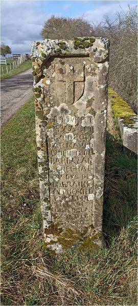 ne journée particulière que fut ce vingt-cinq mars : nous eûmes droit aux quatre saisons dans la même journée ! Le temps, certes annoncé, ne gâcha pas pour autant les découvertes auxquelles nous fûmes conviés. Trois destinations étaient au programme de la matinée. La première nous amena à Bulgnéville, à l’emplacement de la maison (aujourd’hui disparue) où décéda le maréchal Arnaud de Barbazan envoyé par le roi Charles VII soutenir le nouveau duc de Lorraine, René d’Anjou, son beau-frère, alors en conflit armé avec Antoine de Vaudémont-Joinville qui lui contestait ce titre. Tout ceci nous ramena à un conflit d’héritage de la couronne ducale et à l’année 1431 (2 juillet), juste après le décès du duc Charles II qui avait marié sa fille aînée, Isabelle de Lorraine, à l’Angevin. Le récit de la bataille de Saulxures-lès-Bulgnéville, qui eut lieu à quelques centaines de mètres du lieu où nous étions - nous ne pûmes nous y rendre en raison de l’étroitesse de la chaussée- permit à chacun de mieux comprendre les stratégies employées par le duc de Lorraine et ses alliés dont l’évêque de Metz, Conrad Bayer de Boppard et Robert de Sarrebruck, d’une part, et celles d’Antoine de Vaudémont et de ses alliés bourguignons (le maréchal Toulangeon, grand vainqueur de la bataille) d’autre part. Un cas d’école où, en une demi-heure, le tour était joué ! Le duc de Lorraine ainsi que l’évêque de Metz furent faits prisonniers (le premier resta cinq ans en détention et ne fut libéré que contre une énorme rançon de 400 000 écus d’or) et les Lorrains mis en déroute. Un carnage aussi (2 000 morts, un, toutes les secondes !). Une bataille des plus courtes aux conséquences importantes tant au plan local qu’au plan « international » (la Lorraine et la Bourgogne ne faisaient pas partie du royaume de France).